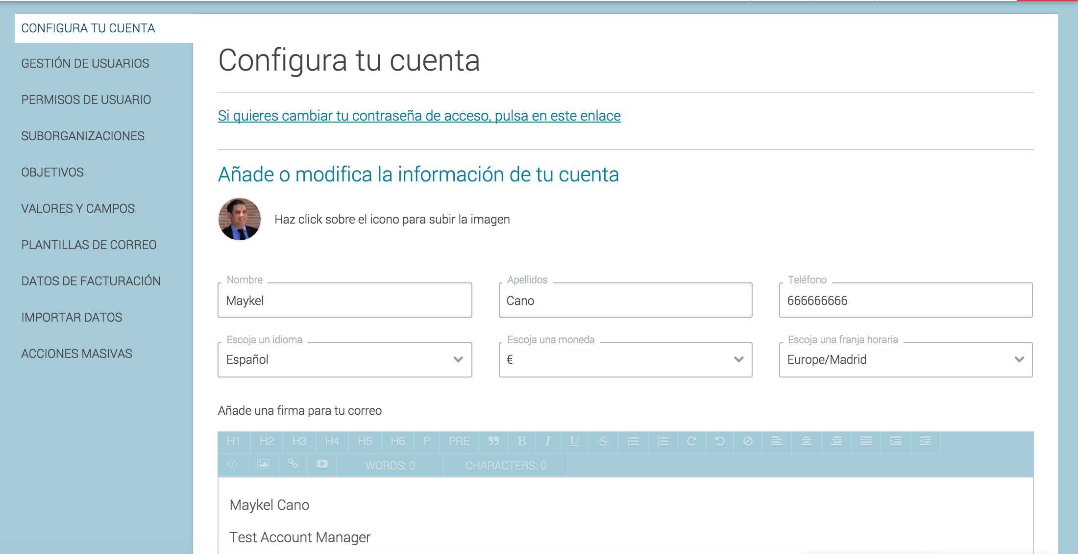 Desde aquí podremos cambiar nuestra contraseña, editar nuestra firma, subir nuestra Foto y Nombre en 'arewedoing. Si pulsamos sobre la imagen podremos subir nuestra foto de perfil, en el campo nombre aparecerá y podremos modificar nuestro nombre, podremos cambiar nuestra moneda, zona horaria y por último en el campo de redacción podremos establecer nuestra firma: