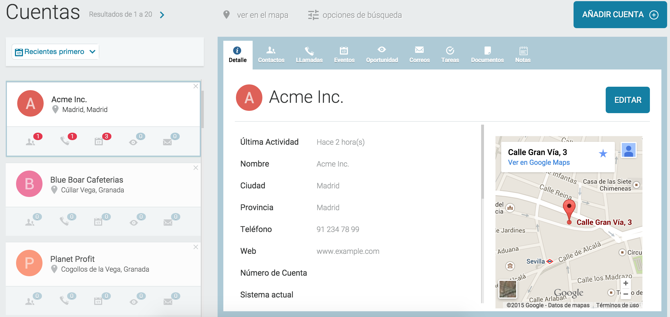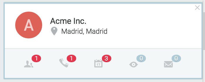 En cada tarjeta de cuenta aparecen unos iconos en su parte inferior para poder acceder de forma rápida a los elementos relacionados con ella como las llamadas, reuniones, emails, oportunidades, etc…