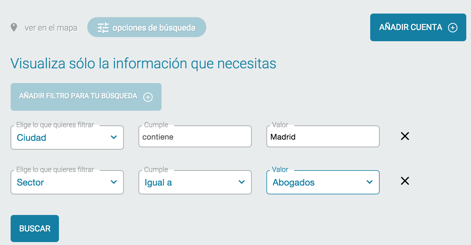 Como hemos comentado podemos utilizar el buscador para localizar cuentas, Si necesitamos ser más precisos con nuestras búsquedas podemos utilizar el botón Opciones de Búsqueda para poder localizar Cuentas que cumplan los requisitos que establezcamos en esta sección.