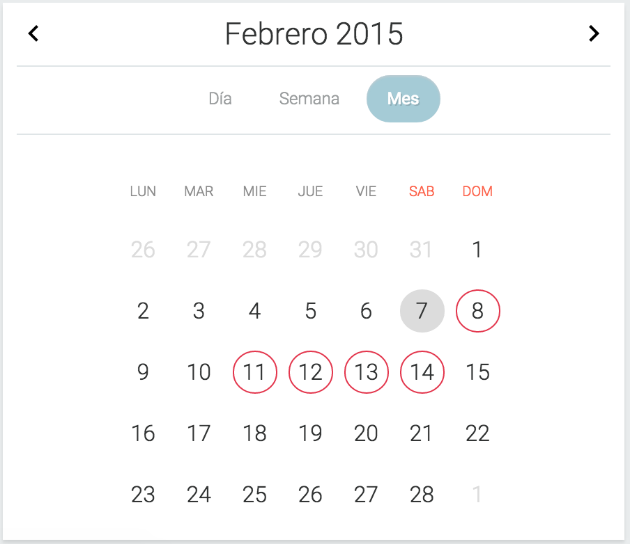 Haciendo click en la pestaña Tareas se nos muestra la interfaz de gestión de tareas, como podemos ver en la imagen contamos con un calendario donde están reflejados eventos con un círculo rojo en los días correspondientes.