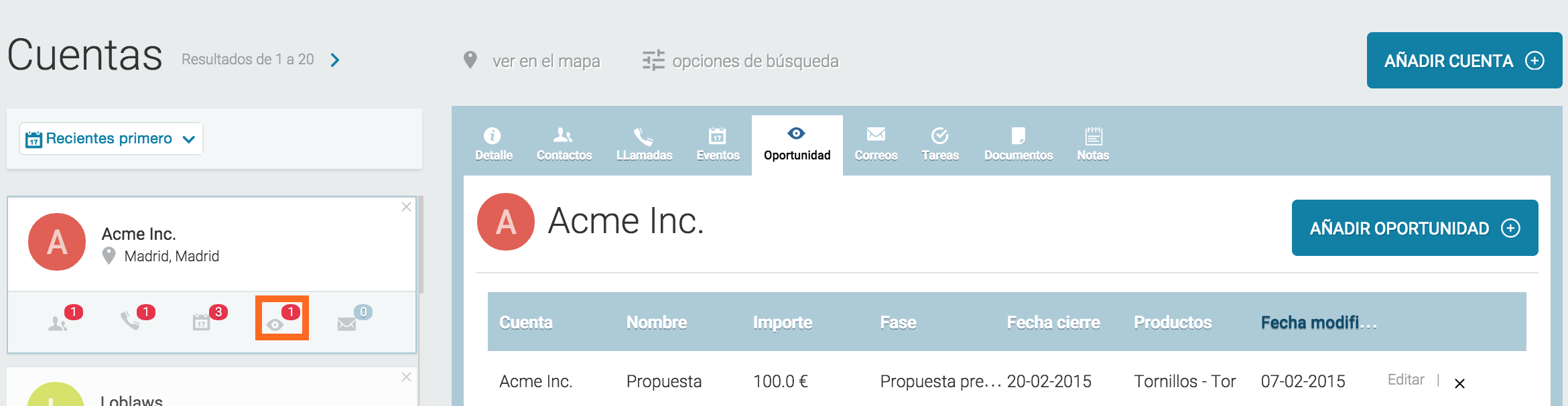 La gestión de oportunidades se realiza desde la propia Cuenta o Contacto al que queremos asociar la Oportunidad. Por lo tanto para generar una oportunidad vamos a una cuenta o contacto como se muestra en la imagen, pulsamos en el icono de oportunidad y se nos muestran en la parte derecha de la pantalla las oportunidades relacionadas con dicha cuenta:
