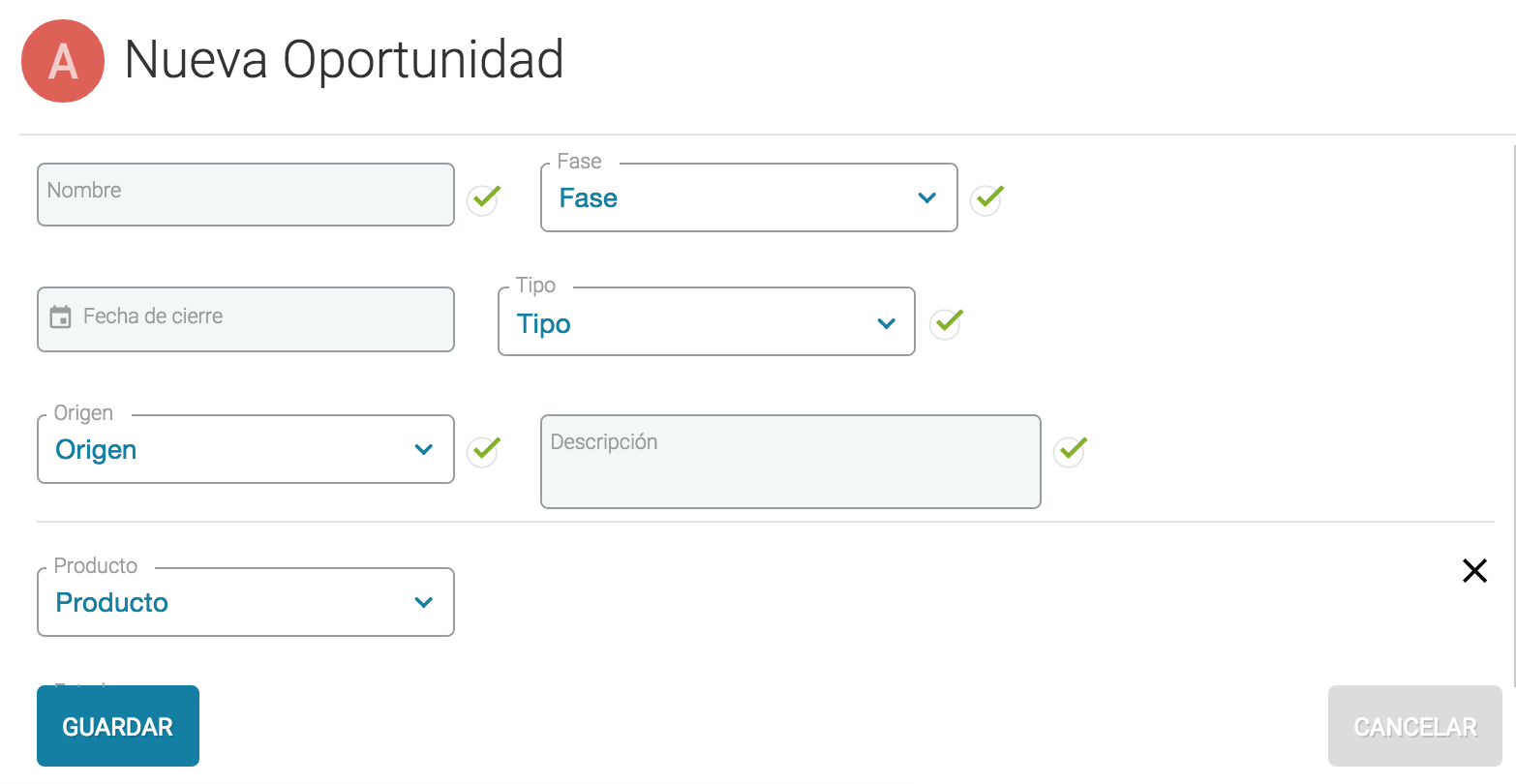 Podremos incluir un nombre y una fecha de cierre. Por otro lado desde los menús desplegables de Fase, Tipo y Origen seleccionaremos en qué fase se encuentra dicha oportunidad, qué tipo de negocio es y el origen de dicha oportunidad respectivamente. Añadiremos una descripción si es necesario incluir algún comentario.