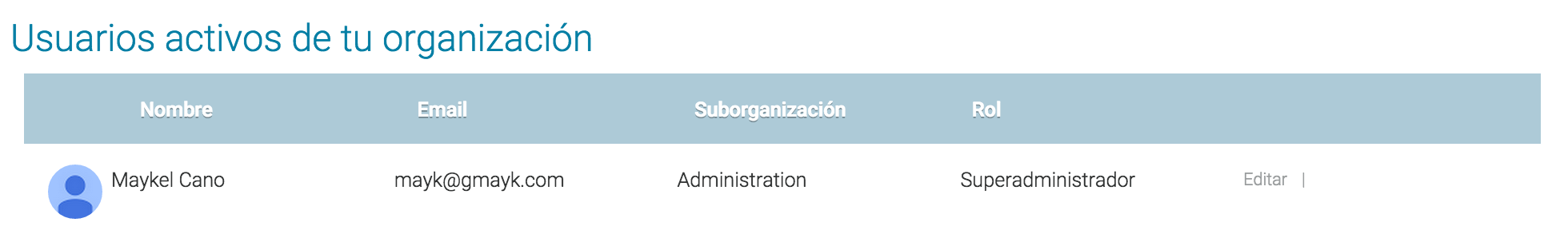 Como vemos en la siguiente imagen, para dar de alta un usuario necesitamos su nombre, correo electrónico, la suborganización a la que pertenecerá, el rol que le vayamos a asignar y su contraseña. En la parte derecha aparece sombreada una imagen para que podamos añadir la foto de perfil del usuario.