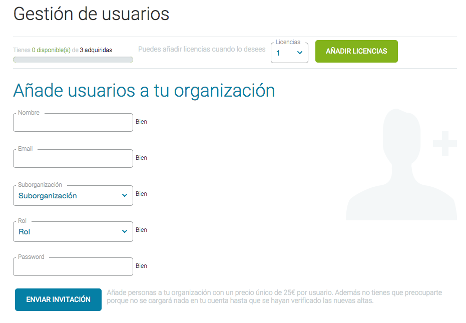 A medida que damos de alta usuarios se nos van descontando licencias de las disponibles, siempre podremos adquirir más licencias en caso de que necesitemos dar de alta más usuarios, desde la barra superior seleccionando el número de licencias y pulsando en el botón verde de Añadir Licencias.