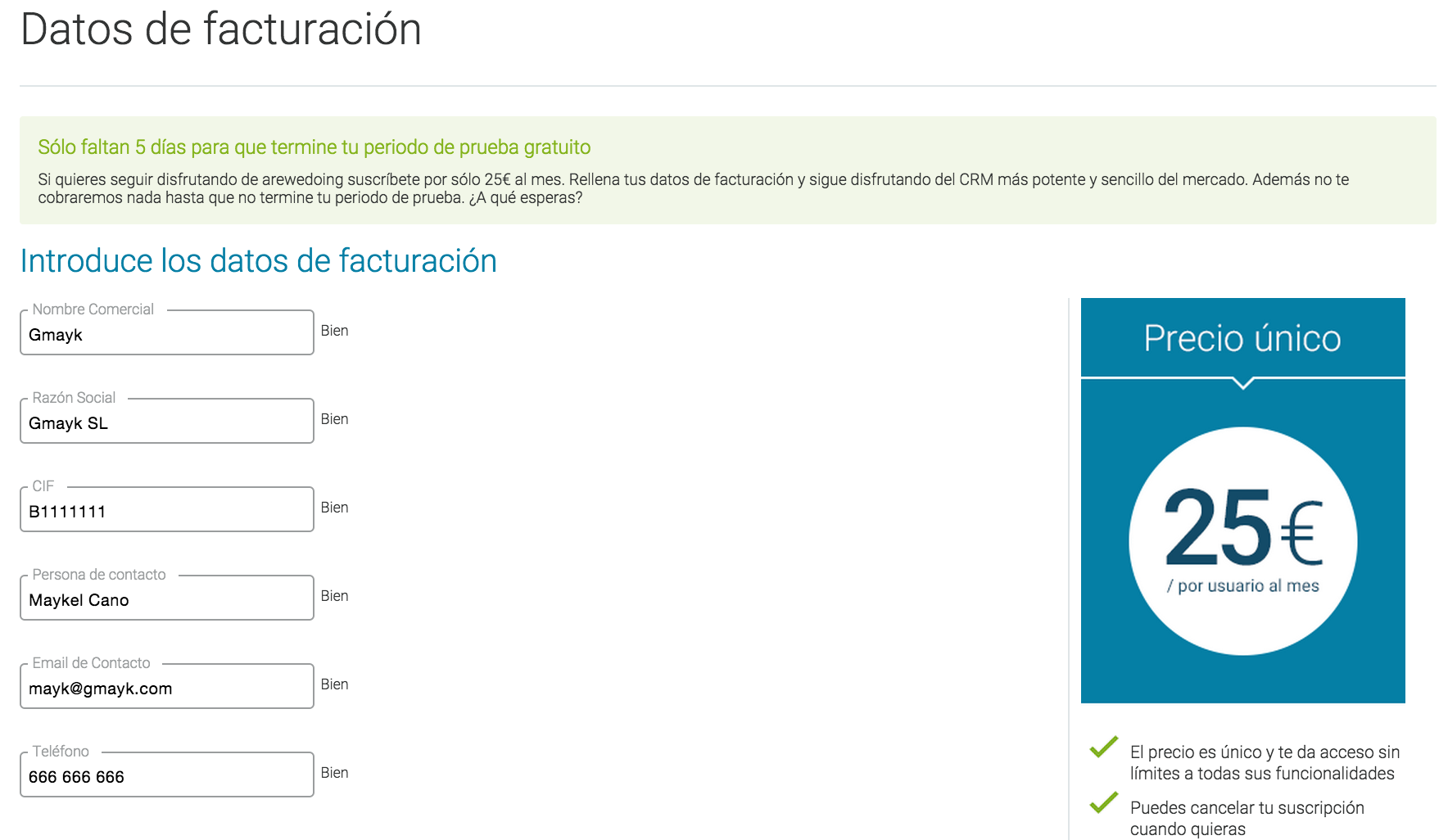 En este apartado introduciremos los datos de facturación. Si has comenzado un Trial recuerda rellenar estos datos antes de 15 días para poder seguir disfrutando de ‘arewedoing. Una vez tengamos rellenos los datos de nuestra empresa, pulsaremos en Suscribirse al final de la página y nos llevará a la zona de pago. En función de las licencias de usuario que tengamos activas en el apartado de Usuarios se nos calculará de forma automática el pago de las licencias.