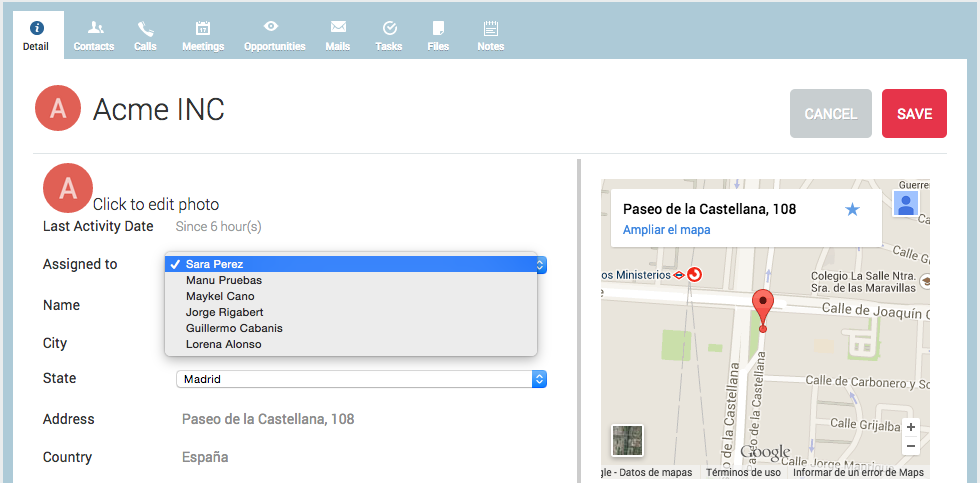 Once you click on save, the user we have selected can see all the elements related with the account or contact (contacts, calls, emails, etc...).